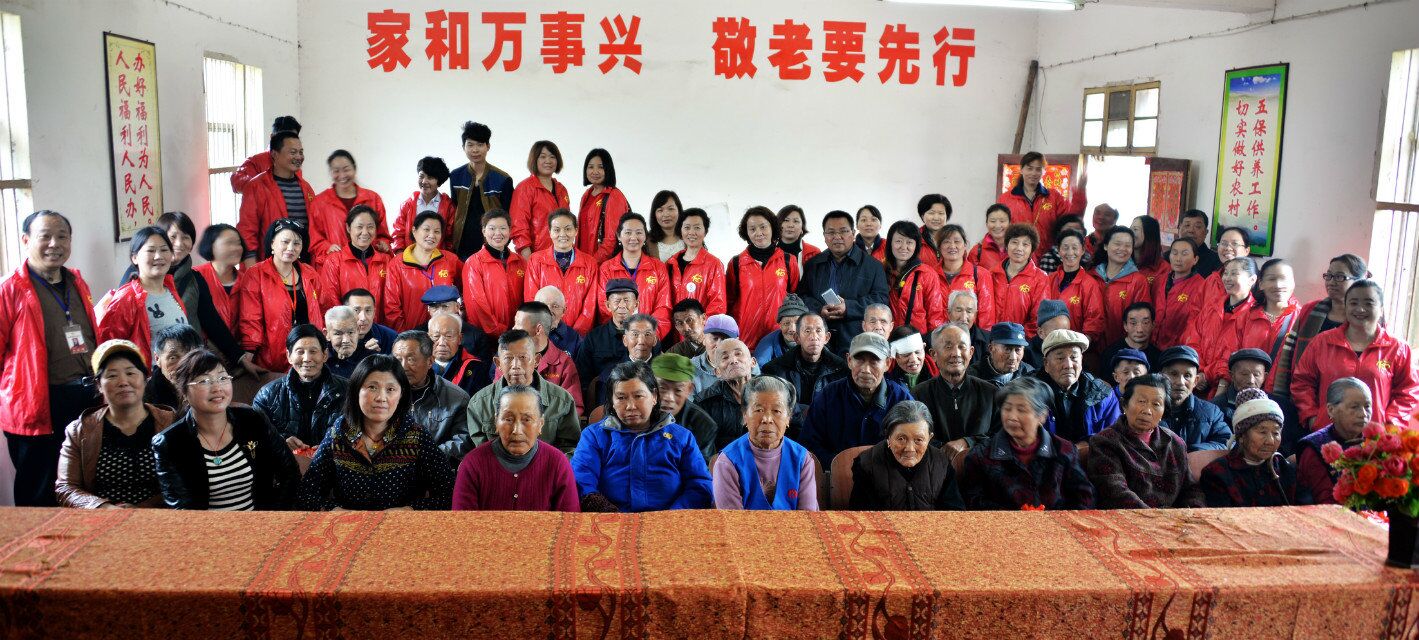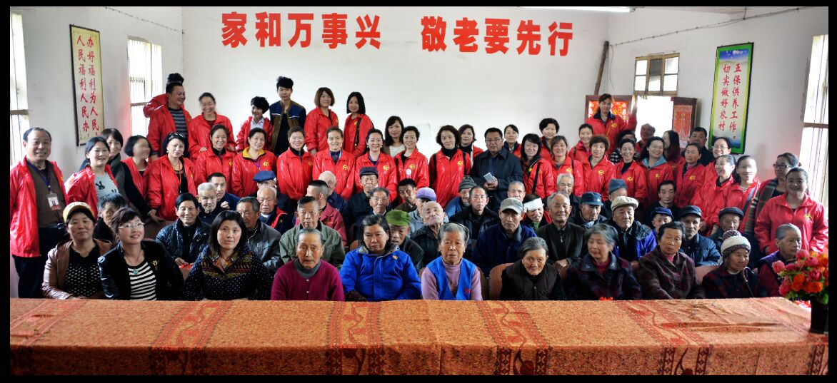 十二点半,吃饱了肚子,脸露笑容的老人们齐聚活动室,六十五位老人每人一份礼品(一套内衣---由爱心人士李科和捐赠,一斤饼干---由爱心人士项女士捐赠),并集体合影留念。