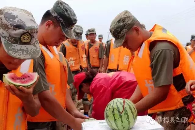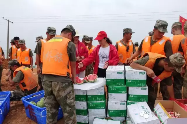 ▲“爱心义工协会”为奋战在下新堤上的官兵干群送去了西瓜和矿泉水为他们降暑解渴