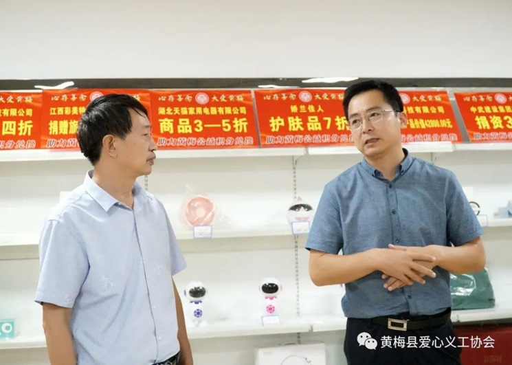 在公益积分兑换商店,陈军副司长向黄梅县慈善会会长李仲良了解公益积分兑换商店的商品来源、兑换情况等各方面的问题,对公益积分兑换商店给予肯定,同时提出建议。