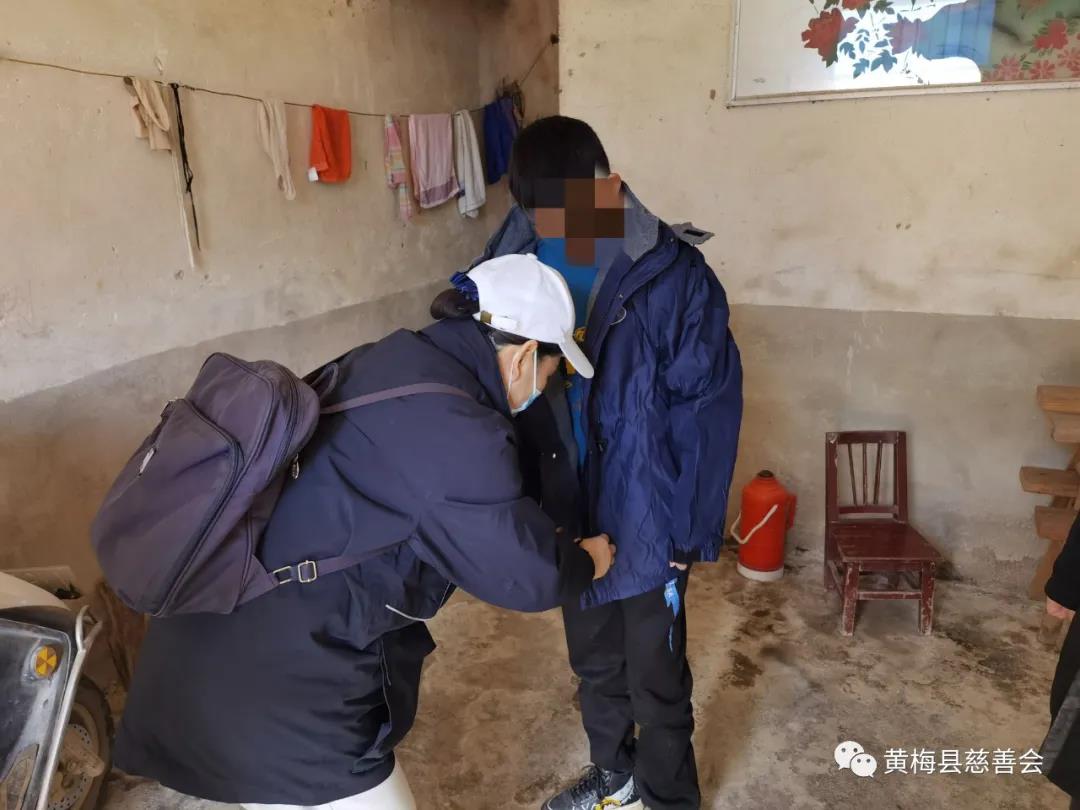 有一群孩子身处困境但自强不息,他们因为各种原因生活在孤独和贫困中,即使在这种环境中生活,他们仍然怀揣梦想,努力生长,面对困难勇于挑战,接受点滴帮助满怀感激。杉木乡周铺村的方同学,今年12岁,就读于滨河中学,父亲和爷爷去世,姐姐在武汉读铁路职业学院,和妈妈相依为命还要照顾年迈的奶奶,家里经济条件十分困难。了解到方同学家的情况,志愿者们顶着寒风,带着精心挑选的礼物,来到方同学家中,为他和家人送去冬日的问候和关怀。志愿者与方同学近距离的沟通、交流,详细了解他们的学习和生活情况,鼓励她们勇于面对暂时的困难,树立信心,保持积极向上的学习态度,学会自立自强,健康快乐成长,随后并亲自为方同学穿上棉袄。看到方同学穿上新衣服后眼里闪烁的喜悦,摸着新衣服嘴角露出的微笑,在场的人都在凛冽寒冬里感受到了如沐春风的温暖。