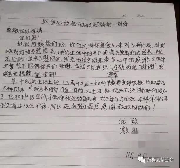 苦竹下塆村的黄同学在读高中,听说志愿者要来,因为当天不在家里,留了一封信在家给志愿者。字里行间都是对志愿者表示感谢,并且表达了要努力学习的决心。