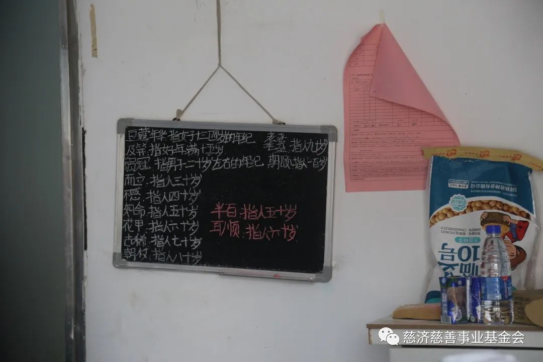 一进屋,志工就被墙上挂着的小黑板吸引住了目光。上面工工整整地写着古代年龄称谓和现代对应的年龄,小雅说这是平时学习到的内容。志工了解到,小雅在镇上读小学五年级,成绩优秀,名列全年级前三名。