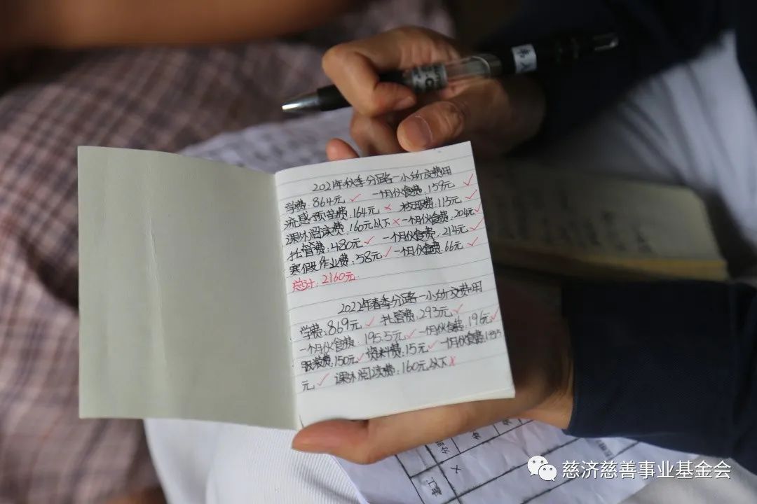 当志工询问小雅学费多少时,她将平时用来记录各项开支的手帐本拿给志工看。志工问:“你为什么要自己记录呀?”小雅说,很心疼爷爷奶奶,养育自己不容易,将点点滴滴记录下来,以后努力报答爷爷奶奶。