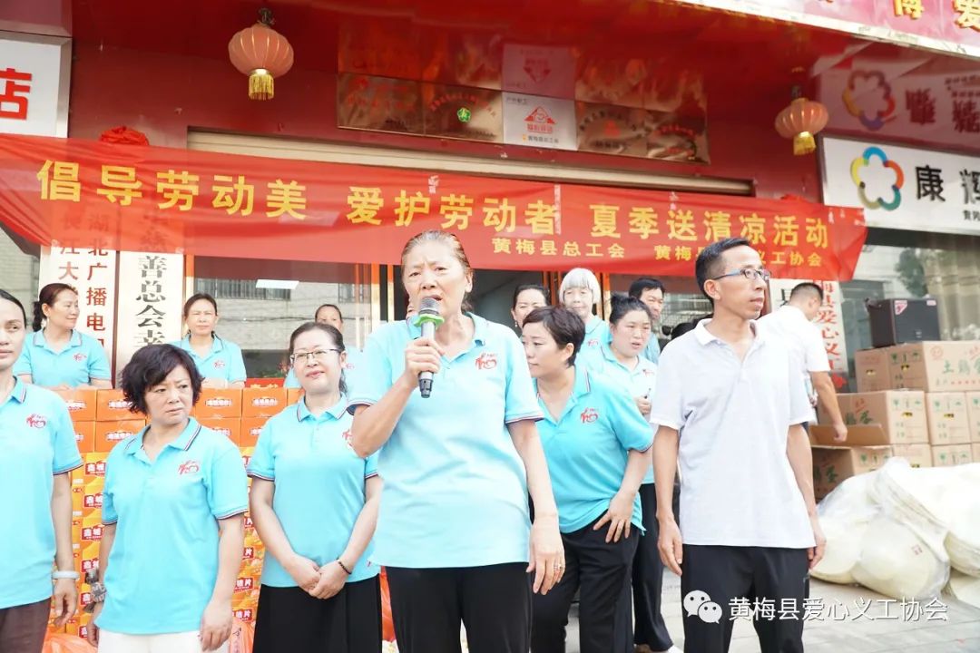 黄梅县总工会柳向阳副主席和爱心义工协会会长虞红霞分别发表了简短的讲话,他们向环卫工人表达了敬意,感谢环卫工人们对城市的付出,在酷夏来临之际,为大家送上清热解暑的物资,祝大家越来越好!