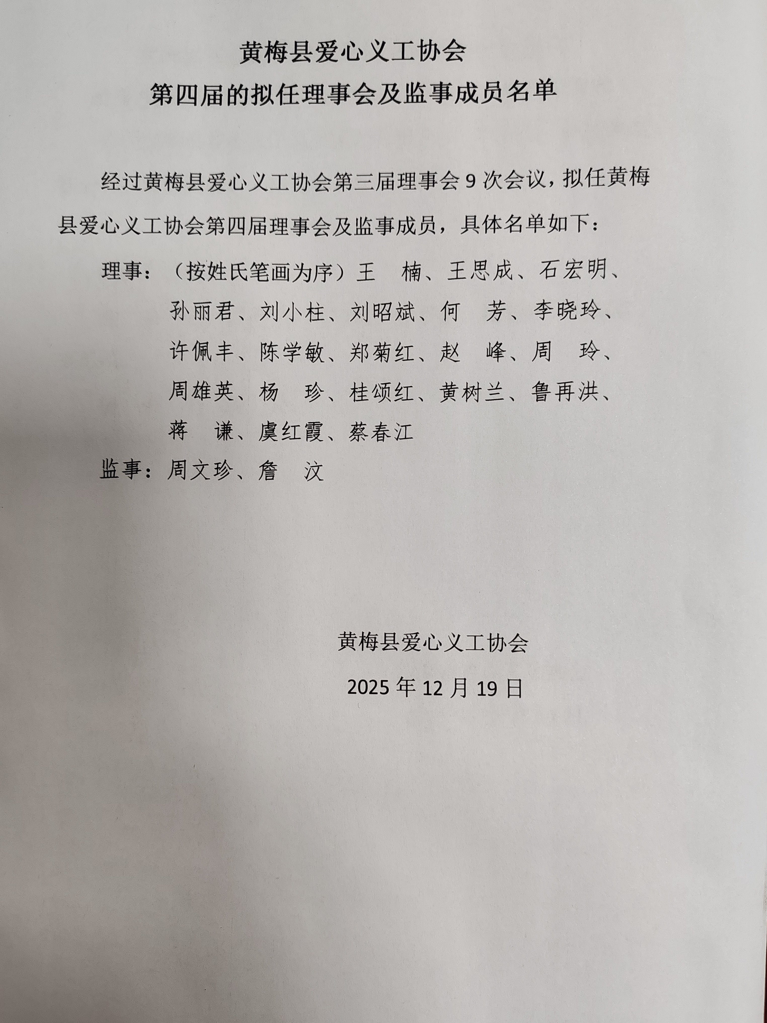 黄梅县爱心义工协会第四届拟任理事会成员、监事名单