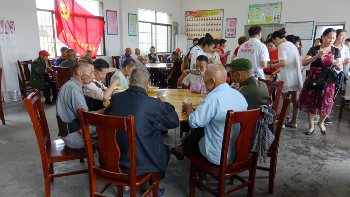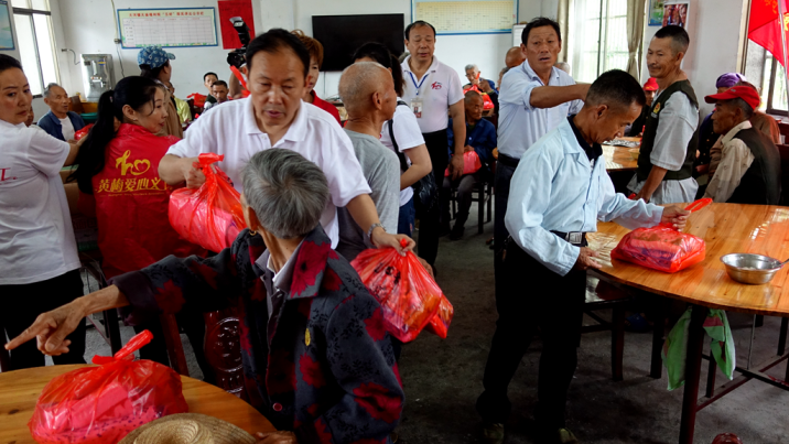 八点钟,满载着爱心党员和爱心会员的中巴车,带着迎风飘扬的党旗,迎着沥沥的细雨向大庙福利院奔去,当来到考田水库吴祥村红十五军诞生地时,大雨倾盆,天公是乎在告诉我们,从风雨中走来的共产党人一定要迎着风雨把爱心送到福利院老人们的手上。