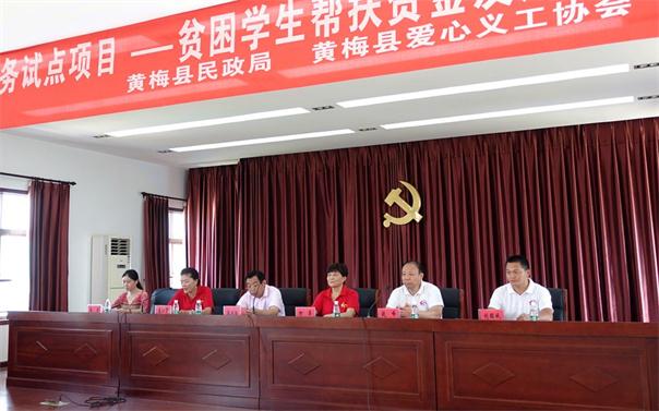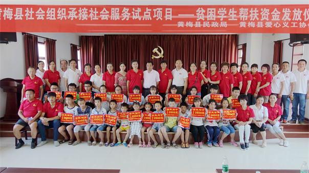 2017年8月25日上午9时,黄梅县社会组织承接社会报务试点项目暨贫困学生帮扶资金发放仪式在黄梅县民政局六楼会议室举行,黄梅县民政局,黄梅县爱心义工协会,部分社会爱心人士,受助学生及受助学生家长共八十多人参加。