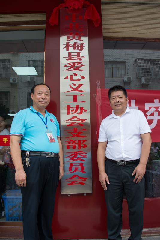 2019年7月10日上午黄梅县爱心义工协会举行揭牌仪式,县委组织部常务副部长与爱心义工协会党支部书记赵峰在“中共黄梅县爱心义工协会支部委员会”牌匾前合影留念。