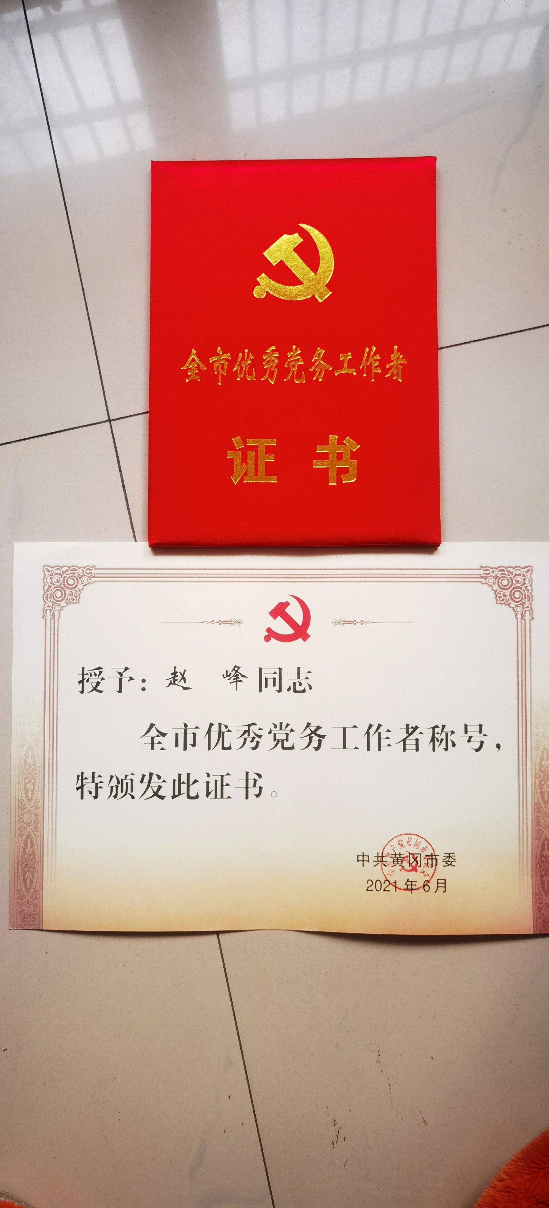 赵峰书记荣获“黄冈市优秀党务工作者”称号